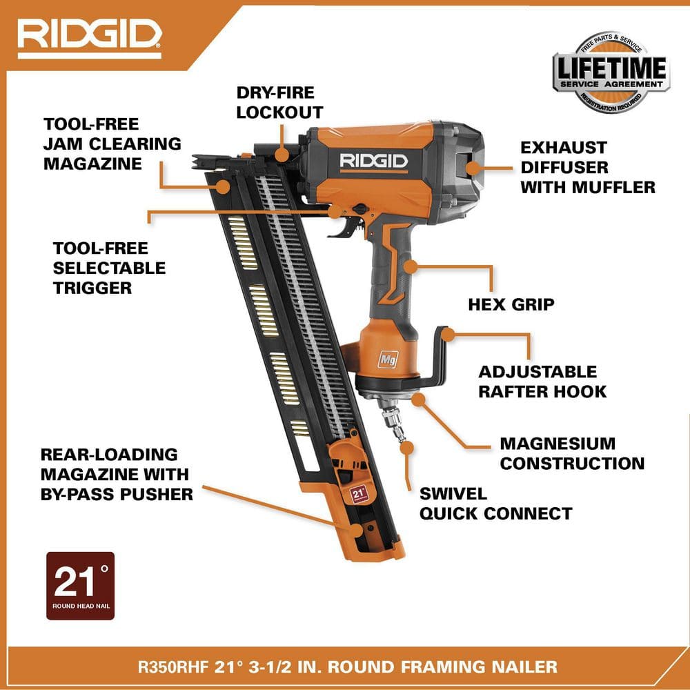 RIDGID introduces the 21-Degree 3-1/2 in. Round Head Framing Nailer. Featuring Magnesium Metal Housing, this nailer is the fastest in its class at 8 nails per second compared to competitors 3 nails per second. This nailer is backed by the RIDGID Industry Leading Lifetime Service Agreement. That means FREE Parts. FREE Service. For LIFE. Included with the Round Head Framing Nailer are a swivel quick connect, no-mar pads, and an operator's manual.