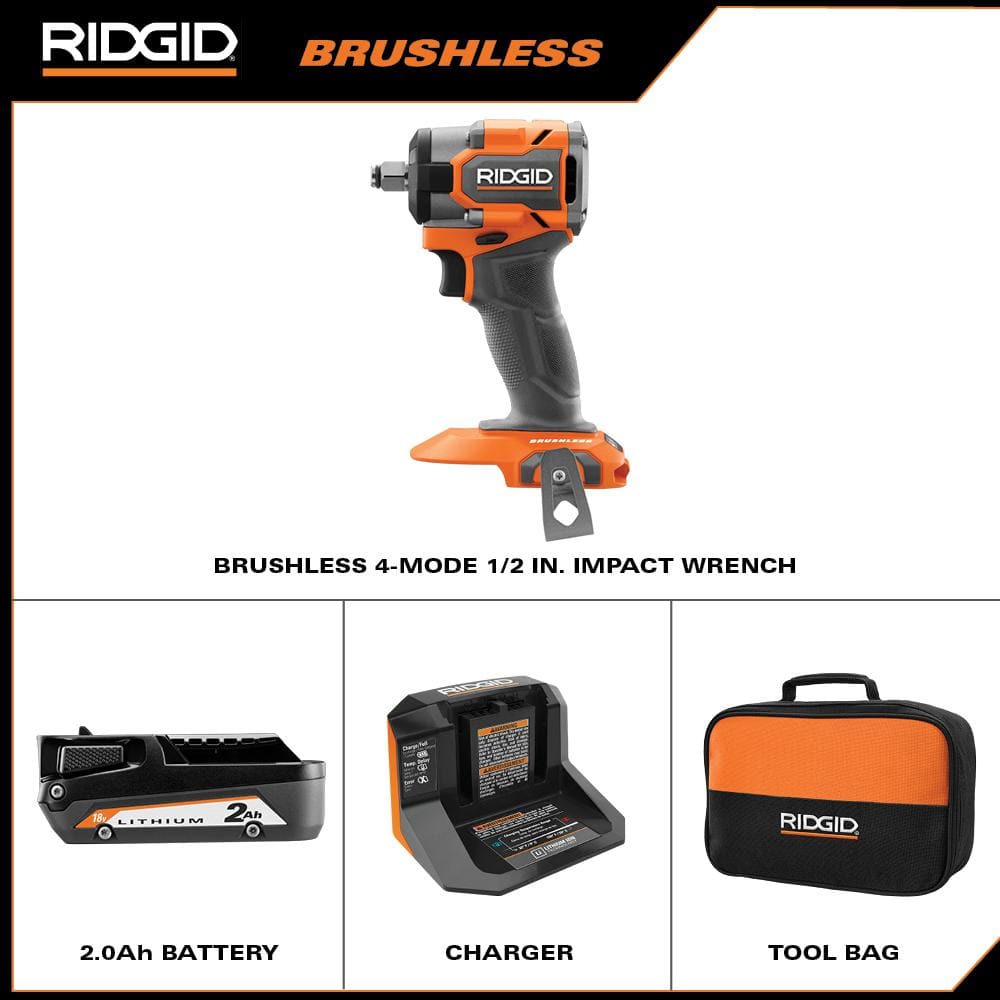 RIDGID introduces the 18V SubCompact Brushless 4-Mode 1/2 in. Impact Wrench Kit. The RIDGID SubCompact Brushless lineup pairs powerful brushless motor technology in a compact tool design. This 1/2 in. Impact Wrench is the industry’s most compact, delivering 250 ft./lbs. of breakaway torque. Built with 3 speeds and an auto tightening mode, users can adjust speed and power for added control. This brushless impact wrench utilizes auto-tightening mode to automatically stop when fastening bolts to prevent over tightening. In reverse, this mode delivers full breakaway torque, then stops when the bolt is loose. It features a Tri-Beam LED light that enhances visibility and provides an even distribution of light, making it ideal for working in low-light conditions. As always, this RIDGID 18V SubCompact Brushless 4-Mode 1/2 in. Impact Wrench is 100% compatible with all RIDGID 18V batteries. Best of all, this tool is backed by the Industry’s Best Lifetime Service Agreement, simply register within 90 days of purchase for FREE Batteries, FREE Parts, FREE Service, FOR LIFE. The RIDGID SubCompact Brushless Impact Wrench includes the 18V Brushless 4-Mode 1/2 in. Impact Wrench, 2.0 Ah battery, charger, belt hook with screw, and tool bag.